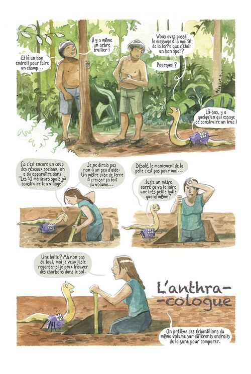 Pour donner plus de bonne humeur à la recherche, la bédéaste a décidé une approche plutôt humoristique. Ainsi les personnages principaux sont une mygale et un anaconda. Ils rencontrent une bande d’humains qui font des trucs bien étranges. Ils creusent des trous, prélèvent des feuilles, étudient des champignons… Etrange comportement. C’est là que l’on découvre des métiers assez spécifiques comme anthracologue (étude du bois carboné), géodrilologue, dendrologue, anthropologue, botaniste… Ils ne sont pas là par hasard. Le lidar a repéré des traces d’anciennes civilisations dans cet espace. Ils cherchent des preuves par tous les moyens possibles tout en impliquant les autochtones. Pour ce qui est de prendre des objets, non végétaux, impossible de les prélever. Il faut respecter la culture locale et le faire en concertation avec les autorités. Et tout prendra beaucoup de temps. Il est même possible qu’il n’y est pas de suite car des budgets sont nécessaires. L’autre difficulté repose sur l’organisation de réunir plusieurs individus spécialisés dans des domaines différents.