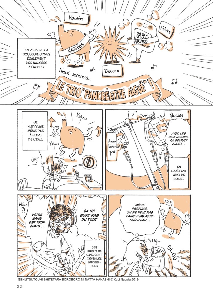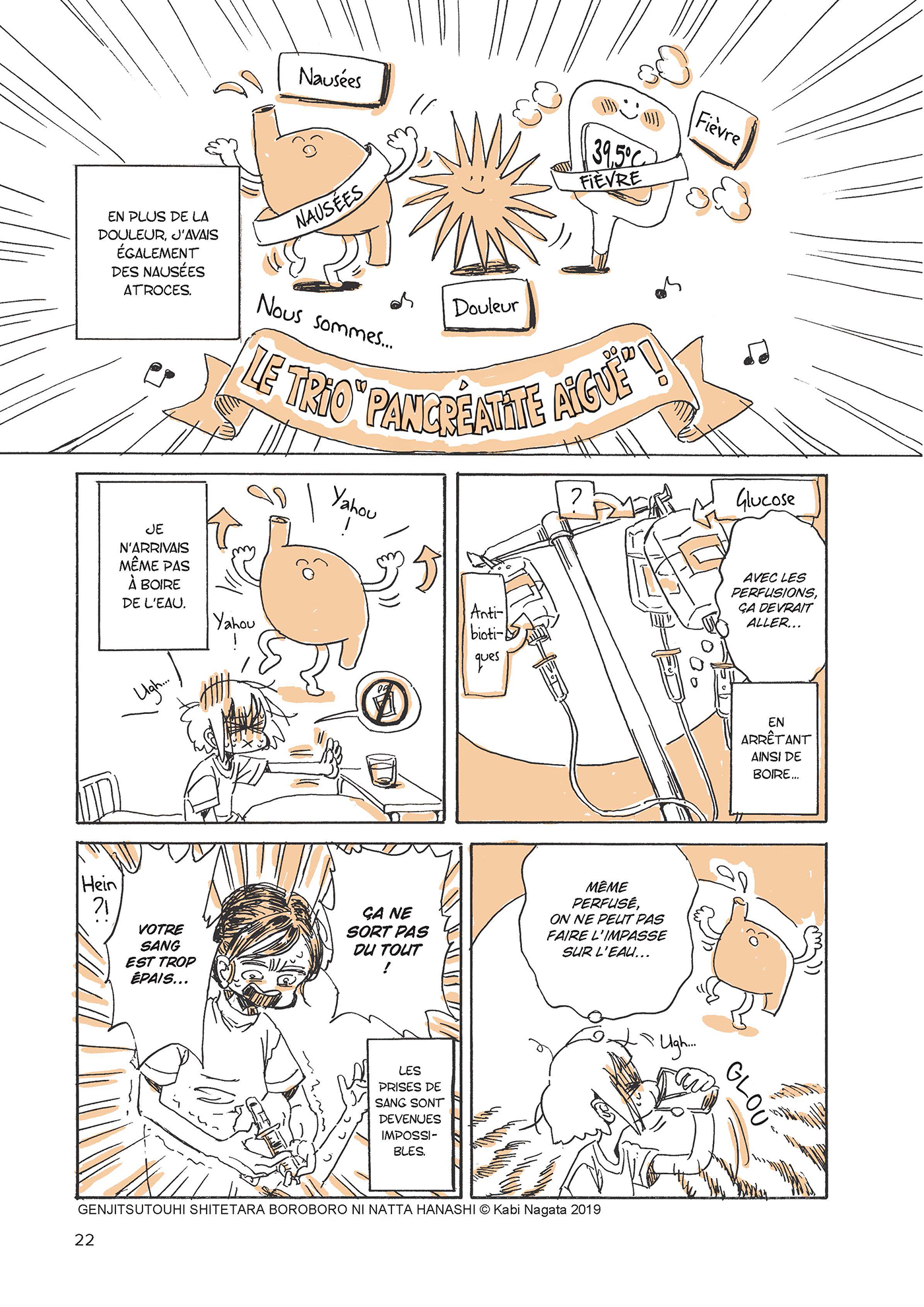Au titre « Boire pour fuir ma solitude » on aurait pu croire que le sujet principal était l’alcoolisme. Et bien ce n’est pas vraiment le cas. C’est plutôt un moment de vie de la mangaka. En effet, un moment assez fort puisqu’elle a eu une pancréatite aiguë et une stéatose hépatique. Elle n’a pas eu d’autre choix que d’aller à l’hôpital et de devoir y rester un moment. La cause de cette maladie est une consommation importante d’alcool quotidienne. L’alcoolisme est une maladie assez grave. Toutefois il semblerait que cela est assez acceptable au Japon. D’ailleurs, cela sera souligner dans le récit. Un médecin précise qu’en Europe, c’est même interdit de boire dans l’espace public. Toutefois, on n’a pas l’impression que Kabi Nagata est reçu une vraie prise de conscience que sa vie dépendait de son addiction. Elle avait un peu peur au début. Puis comme les résultats n’ont pas de lien avec ce qu’elle boit donc elle se fait plaisir. Personne n’essaie de l’accompagner vers l’abstinence. Elle a peur d’aborder le sujet car elle va se faire juger des lecteurs. Au final, elle le fait car aucun doute que plus d’un lecteur s’identifiera à elle. Après tout, elle en croise des individus dans les bars et restaurants qu’elle fréquente.