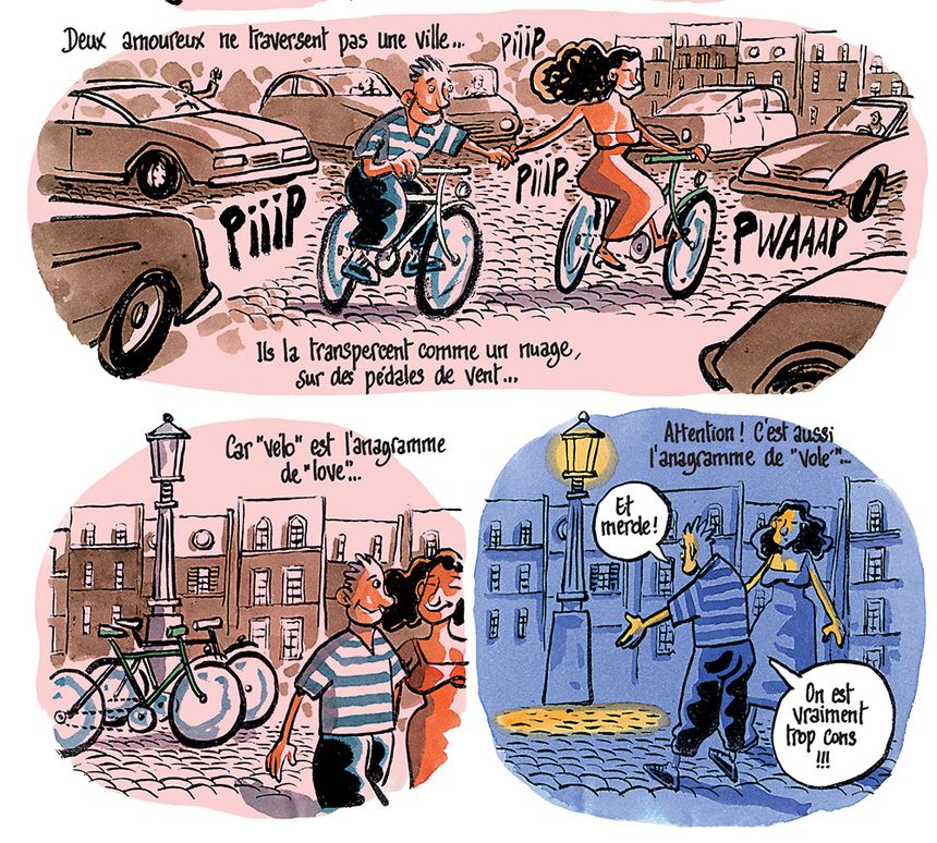Il y a 20 ans, Didier Tronchet publiait déjà une bd sur la pratique du vélo. Il revient en 2020 avec une nouvelle version où il se met en scène sur un deux roues. Une page suffit pour raconter une histoire ou un gag en rapport avec une aventure en biclou. Les pratiquants ne manquent pas. Surtout depuis le confinement avec les fameuses coronapistes qui ont émergé un peu partout en France. La cohabitation avec les voitures n’est pas toujours aisé. Il y a un risque de se faire écraser ou frôler par eux dans l’espace public. Il les plaints ces conducteurs toujours étouffés, en colère, pressés, qui courent après le temps. Alors que le plaisir est au rendez-vous quand on pédale. On peut même faire des rencontres assez charmantes. Bien entendu, il ne faut pas omettre le bien-être que cela procure. Pédaler c’est bon pour la santé. Ne pouvait-on rêver une meilleure apologie de la pratique cycliste? Toutefois, il n’oublie pas d’évoquer les légèretés que se prennent les vélocipédiste par rapport au code de la route. On peut se demander ce que penserait le bédéaste du vélo électrique ainsi que les accidents des deux roues de plus en plus courants.