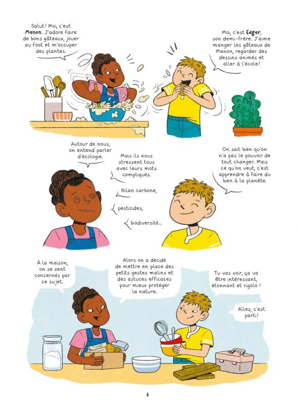 Dans la famille Green, vous rencontrez Maman Jo, Bébé Gaston, Papa Hector, Edgar et Manon. Une petite tribu pleine de vie, d’enthousiasme et d’énergie communicative. Pour eux, l’écologie a vraiment un sens et ils veulent un monde meilleur dès aujourd’hui. Pour ça, ils ne vont pas compter sur des industriels ou l’Etat pour des micro-actions qui auraient des effets dans éventuellement 10 ans minimum. Ils prennent les reines dans ce qu’ils peuvent maîtriser et agissent concrètement. Pour ça, le champ des possibles est assez grand surtout quand on est motivé et curieux. Il y a pleins de petites choses du quotidien qui une fois servies deviennent des déchets. Au lieu par exemple de jeter du papier essuie-tout pourquoi ne pas faire le sien réutilisable? De même avec du fils étirable, pourquoi ne pas systématiser le bee wrap à la place que l’on peut fabriquer chez soi. Le constat se fait aussi bien sur l’éventuelle dangerosité des produits ménagers ou la lessive. Quand on regarde les composants d’une lingette pour nettoyer les fesses de bébé, on peut se demander vraiment qu’elles sont tous ces composants et leur risque de toxicité à court et long terme. Une nouvelle incitation à trouver des alternatives à la maison. Pour le bonheur de l’estomac et de la biodiversité, prendre soin de son jardin en bonne intelligence est possible. Ensemble, ils construisent un hôtel à insectes, des cabanes à oiseaux, un lombricomposteur… Une aventure incroyable au quotidien avec son lot de rebondissements et de partage.