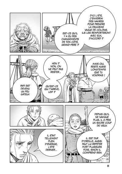 Thorfinn et son équipage font une brève escale à la ferme de Leif pour lui faire leurs adieux avant leur départ vers le Vinland. Leif a bien changé… Que de chemin parcouru depuis la mort de Thors et le début du périple de Thorfinn ! Heureusement que Gros-Yeux, lui, semble incapable de changer… Le jour du grand départ est arrivé, la mer s’ouvre à présent devant les voyageurs, pleine de mystères et de créatures inconnues ! Mais lorsqu’enfin ils foulent le sol de tous leurs espoirs, y trouveront-ils la terre utopique dont ils ont toujours rêvé ou un autre monde semblable à celui qu’ils ont quitté, plein de guerres et de violences ?