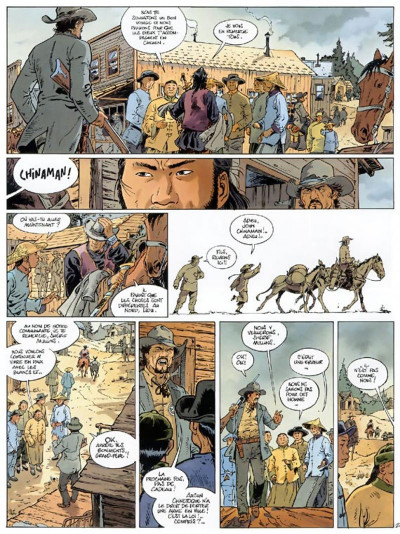 Il le savait bien John Chinaman qu’il ne fallait pas s’intéresser aux affaires des blancs. Mais malheureusement quand il voit un vieil homme se faire agresser, il ne peut rester les bras ballants. Par contre, au combat, il refuse de tuer ou de blesser gravement l’autre. Il a des principes. Même si en face, il a des trous du cul racistes, bêtes, méchants, avides de frics, cruels, misogynes… Il a connu pire dans sa vie donc son égo n’est pas altéré par ce genre de rencontre. Une attitude qui force l’admiration. Et cela se poursuit car il aide une pauvre famille élevant une orpheline. Les grands-parents veulent la récupérer à tout prix et la mettre dans une école pour demoiselle. Le couple refuse d’abandonner la fillette surtout qu’elle souhaite rester avec eux. La diplomatie de notre chinois adoré est à tout épreuve. Grâce à ça, la situation trouve une fin plus positive et constructive. Serge Le Tendre construit un scénario finement précis. Tout est calculé pour valoriser la structure gentil contre méchant. Un tueur profiteur versus un vagabond plein d’humanité. Jamais on ne s’ennuie car le rythme est bien cadencé et on s’attache à notre héros malgré lui. En effet, peut-être qu’il souffre du syndrome du sauveur. Une série qui ne s’essouffle jamais et qui donne envie de poursuivre. On pourrait même se réconcilier avec le genre western. Dorénavant, on va attendre avec impatience le tome 4.