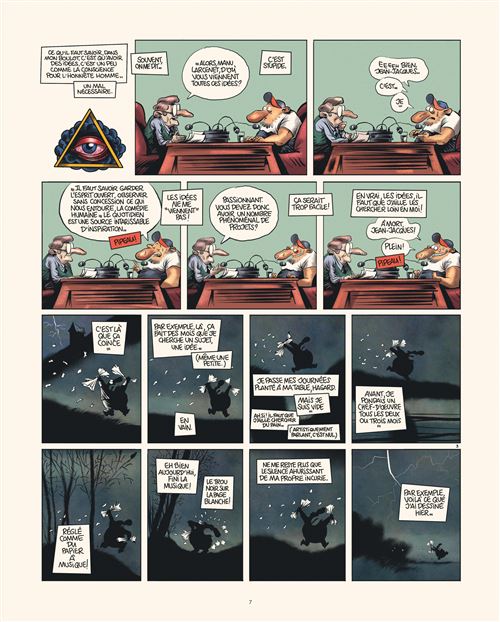 Il est loin le temps de la série « Le combat ordinaire ». Manu Larcenet n’est plus un jeune homme innocent de la vie. Maintenant, il a pris de la bouteille et fait face à un gros courant pour les créatifs. Comment faire face à la page blanche? Ou trouver l’idée de génie qui change tout? L’artiste nous montre son incroyable palette graphique. On ne peut pas le mettre dans une case précise. Dans cet album, il le prouve avec brio. Il se met aussi un peu à nu car il se tourne en dérision et il n’y va pas de mains mortes. Son alter-égo cherche par tous les moyens l’éclair de génie. Personne ne peut lui dire qu’il manque ni de motivation et ni de prise d’initiative. Ainsi il peut nous proposer de courts récits totalement loufoques et improbables. Sans oublier de mettre un peu d’intelligence avec des références à Snoopy, Cézanne, Nietzche ou Raphaël. C’est drôle et percutant. Le fil rouge à ces récits est la souffrance psychologique et la dépression du raconteur. Une folie douce qui gagne le lecteur qui prend du plaisir à s’aventure dans le surprenant. Par chance, il existe encore deux suites. Nous pourrons de nouveau profiter d’un moment d’inattendu.