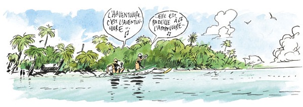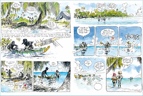 Mais les deux amis ne sont pas là pour faire un bilan sociologique. Ils sont là pour les bateaux. D’ailleurs, les fameux chercheurs, on ne les rencontrera pas. De leur côté, les gars essaient de trouver des Va’a Motu, de comprendre comment ils sont montés, d’en faire un et de naviguer avec. Une aventure plaisante où ils s’amusent sans complexe et en toute légèreté. Leurs pérégrinations les amènent à discuter avec pleins d’autochtones qui leurs apprennent toujours des choses. A cela, s’allie bien entendu des moments de convivialité qui parfois causent des maux de tête le lendemain matin. On sent le plaisir qu’ils ont d’être ensemble et d’expérimenter comme d’autres avant eux. Cette délectation sincère se traduit dans un graphisme très proche de ceux des carnets de voyages. On voit des paysages, des gros plans sur la faune et la flore, le lectorat est immergé auprès d’eux. Le travail à l’aquarelle contribue à cette impression de chaleur, de bonheur et de simplicité. On ferme la bd avec l’impression d’avoir voyager