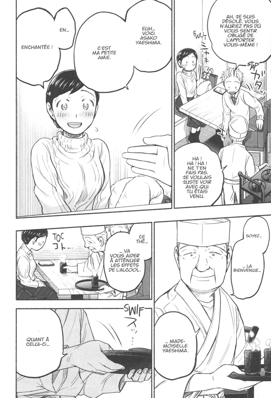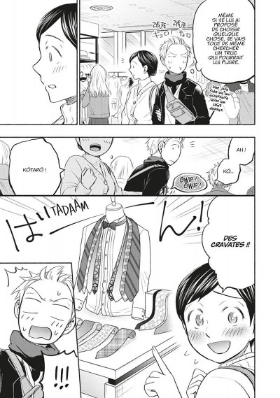 Kintetsu Yamada continue à bien mener sa barque avec son couple fétiche. La relation entre Asako et Kôtarô évolue progressivement et dans le bon sens. La société niponne progresse aussi dans la vision de la vie de couple. On commence à voir émerger comme en France par exemple que l’on peut vivre en couple sans être marié et sans penser aussitôt à avoir des enfants. Le plaisir d’être à deux n’est pas obligé de se caractériser par des impératifs de rôle social, de posture religieuse… Bien que l’on retrouve cela un peu dans la présentation aux beaux parents pour Kôtarô. Ouf, on échappe à l’idée qu’il doit demander l’autorisation au père pour se marier avec sa fille. Une femme peut choisir seule et elle n’est plus la possession paternelle. Mais quand même, l’aval tacite du père et du frère restent nécessaire. Qu’importe cela, on suit deux amoureux qui savent ce qui veulent. Chaque étape prend du temps et c’est nécessaire. Dorénavant, ils se concentrent sur leur futur logement. Ils vont trouver leur futur nid même s’il faut faire quelques modifications par rapport au projet initial. C’est assez mignon de les suivre car très réaliste. Le mangaka s’attarde moins sur des hésitations, sur le besoin du nez à sentir sa belle et sur les relations sexuelles. On est touché par l’authenticité des émotions très vives. Il n’est nullement nécessaire d’artifices, d’évènements improbables, d’un tiers dangereux. Cette fraîcheur sincère est plaisant à lire et prouve que cela est possible. Vivement la suite pour la rencontre avec la belle famille d’Asako avec la belle maman aveugle. De jolies preuves d’amour vont émerger, à n’en pas douter.