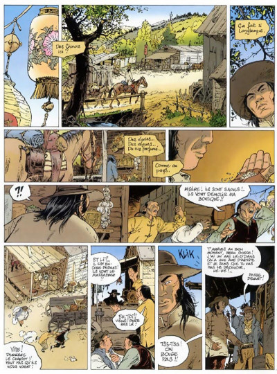 La bd prouve que dans l’essor des Etats-Unis les chinois étaient déjà présents. La construction du chemin de fer est permise grâce à des nombreuses communautés, les fameux mangeurs de rouille du titre. Ce n’est pas parce que les historiens américains ont blanchi leur Histoire, que l’on ne peut pas prouver des faits. Ce qui est assez difficile à lire se sont les séries d’insultes et les comportements racistes. Quand une jeune femme est amenée comme prostitué pour les hommes du chantier, elle devient une esclave. La plupart trouve cela normal. Elle risque qu’on lui coupe le nez si elle tente de s’enfuir. Une menace qui était une technique courante chez de nombreux colons dans le monde entier. D’ailleurs dans la bd « Hoka Hey » de Neyef, on a le droit à une case sur une des personnages qui se l’est fait coupé. Une image assez marquante. Le récit retrace une haine et violence ordinaire qui n’a malheureusement guère changer avec le temps. Il est dommage que parfois les fictions se rapprochent trop de la réalité. L’essor et de l’importance de la presse est bien souligné avec la présence d’un journaliste qui parle de la conquête du territoire. Pas besoin de voir des massacres d’indiens pour avoir des choses exotiques à raconter. Le nom du personnage central va sortir dans le journal. Est-ce que cela aura un impact pour la suite des aventures? Nous le saurons en nous plongeant dans le tome suivant.