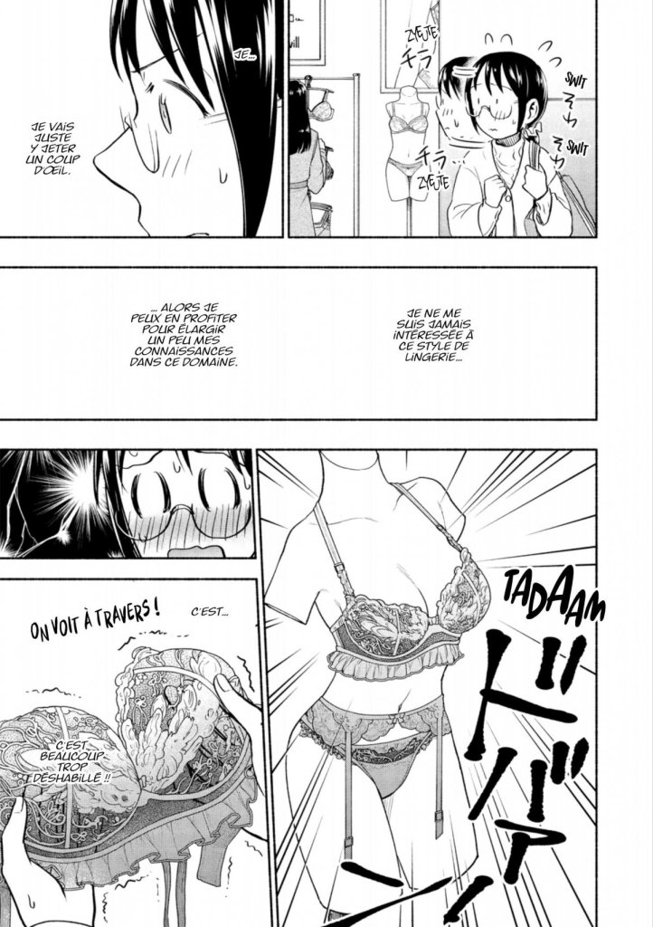 L’enthousiasme de la lecture s’est vraiment essoufflé dans ce tome. Kintetsu Yamada faisait souffler un vent de modernité dans le manga romance jusqu’à présent. Et puis là, il revient avec une régression dans la relation entre Asako et Kôtarô. C’est déplorable de montrer que dorénavant la demoiselle est la propriété de l’homme. Elle devient un bien et il est le chef. Si quelqu’un l’aborde pour la séduire, elle doit ignorer l’autre et surtout ne pas prendre sa carte de visite. Si elle ose répondre ou autre, cela sera une preuve de non-fidélité. Comment peut-on écrire de telles inepties? Et puis quoi, après on lui met un voile complet pour la cacher aux yeux du monde et on l’enferme à la maison pour que monsieur soit le seul à profiter d’elle? On continue à trouver ça normal s’il l’a frappe car son égo risque d’être affecté si des inconnus la regarde? Comment au 21e siècle, on peut trouver ça mignon de dire que l’autre est à lui et c’est tout. La jalousie est liée à un manque de confiance. S’il y a de la jalousie, il faut peut-être poser des questions avant de se prendre le roi de son royaume. Surtout qu’après, ils commencent à vivre ensemble. Elle a intégré que c’est à elle, en tant que femme, de s’occuper du ménage et de la cuisine à cause de son sexe. Son pauvre compagnon, lui il travaille beaucoup, donc lui a le droit de se reposer. Par contre, elle, après sa journée de boulot, c’est normal qu’elle s’épuise dans leur appartement. Encore une idée ringarde d’un autre temps, où monsieur doit pouvoir mettre les pieds sous la table à la maison et n’avoir aucune contrariété. Pour dresser ce bilan déplorable, les amoureux ont du se disputer afin de se mettre d’accord sur les bonnes bases de leur futur vie de couple et de mariés, bien sûr. Ils ne resteront pas trop longtemps à vivre en dehors des liens du mariage non plus. Il faut penser au qu’en-dira-t’on. Le mangaka rassure tout de même car les deux héros s’aiment, ils sont fou d’amour. La preuve avec les relations sexuelles torrides et des gros plans sur la poitrine plantureuse d’Asako. Est-ce le signe que tout va bien? On est dépité d’avoir fait un bon d’un siècle dans la construction d’une vie à deux. Même dans la fiction, on adule la discrimination et la supériorité de l’homme. Qu’est-ce que la suite va donner? Elle va démissionner pour être femme au foyer et élever leur enfant seule? On espère que les choses redeviennent plus censées et plus modernes.