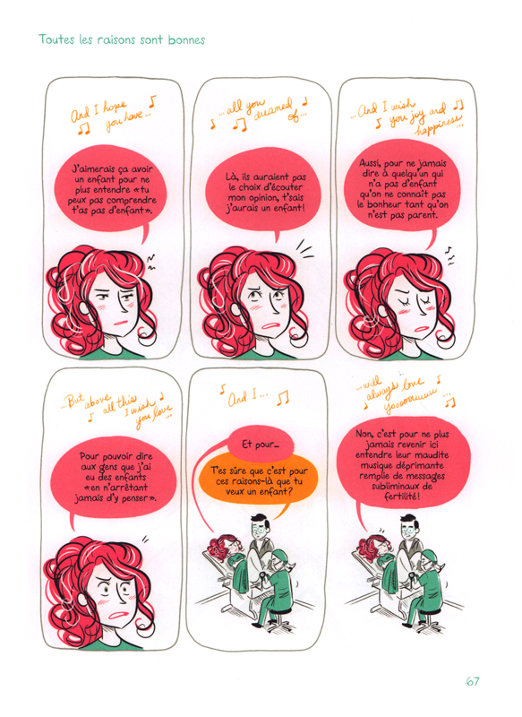 La scénariste apporte beaucoup d’humour dans cette étape de vie. Par exemple, les sauts d’humeur ne sont pas toujours liés au surplus d’hormones qu’elle prend au quotidien. Parfois, c’est juste, normal. Mais je trouve dommage ce choix de ne pas mettre plus de données pragmatiques et réelles. Surtout que le conjoint est un scientifique donc on aurait pu avoir des statistiques ou des approches psychologiques. Par exemple, cette réflexion débile que c’est un blocage psychologique chez les femmes qui cause l’infertilité. C’est logique car tu as tellement envie d’avoir ta progéniture que tes ovaires, qui n’ont pas de conscience, décident de faire la grève. Et par contre, chez les messieurs, l’envie d’avoir un bébé ne nuit pas à l’énergie des spermatozoïdes de se déplacer. Etrange quand même. En effet, des personnalités télévisuelles propagent ce genre de chose tout en sachant qu’ils ne sont pas psy et que deux c’est un hoax. Cela serait bien de déconstruire des vieux clichés qui ont la peau dure. On aurait pu avoir des chiffres sur les statistiques d’infertilité chez les hommes et les femmes qui sont identiques. Toutefois, le récit de l’étape pour avancer n’est montré que du côté féminin. On viendrait à croire comme à une époque très lointaine que seules les femmes sont infertiles. Un gars, image de la virilité ne pouvait qu’être efficace tout le temps. Et dire, que des gens croient encore ce genre d’ineptie. A défaut que cela soit évoquer dans le récit assez gentillet, il aurait pu avoir un petit dossier à la fin avec des données, qui existent en plus. Surtout que l’histoire se finit forcément avec un happy end, comme toutes les bd qui traitent de ce sujet. On pourrait croire que la médecine apporte la solution miracle. Malheureusement c’est bien faux aussi. Est-ce pour cela que le titre de la bd est la fertilité et non l’infertilité? Un choix qui mérite d’être discuté. D’autant plus quand sa vie est avec un scientifique.