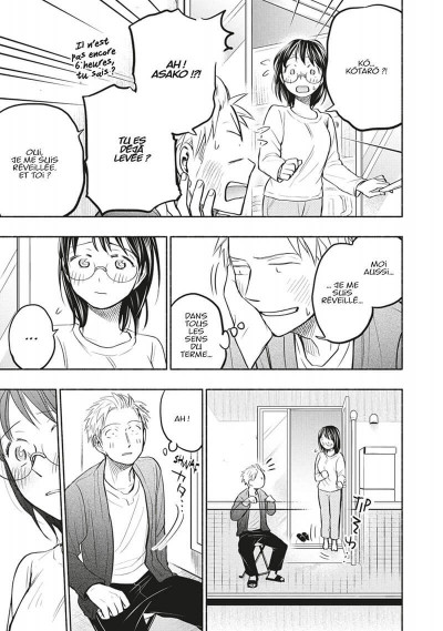 Après une vision rétrograde d’une autre époque dans le tome précédent, l’appréhension était de mise avant de se plonger dans la suite. Mais Kintetsu Yamada a repris ces esprits et on retrouve l’univers gentillet et bienveillant d’auparavant. Asako et Kôtarô apprennent à vivre ensemble. C’est tellement différent qu’être seul. Comment savoir vraiment ce que veux l’autre. Il faut dire les choses et s’adapter pour trouver les solutions. Chacun pli les serviettes à sa façon et on ne peut pas les ranger n’importe comment. Ils cherchent le juste milieu. Des petites choses du quotidien dans lesquelles la plupart des gens pourront se reconnaître. Pour une fois, ils ont quelques jours de vacances tous les deux. Comment faire? Ils finissent par trouver. L’autre épisode important de ce tome est la rencontre avec la belle-famille pour Asako. Que de stress pour elle. Pour qui ce n’est pas un moment malaisant? Surtout que la mère de son cher et tendre est aveugle. Doit-elle se comporter différemment? L’accueil n’aurait pu être des plus chaleureux. D’ailleurs, cela touche tellement la demoiselle qu’elle va en pleurer d’émotions. Ils sont tellement gentils. Aucun doute que nous reverrons des scènes similaires à l’avenir puisque cela devrait se conclure avec un mariage. Le mangaka souligne l’amour qu’ils se portent sincèrement. Une façon également de les rendre attachant. On apprend des choses sur la cuisine. Comme la famille de Kôtaro est dans le thé, on trouve quelque recette à base de cette plante. La cuisson du riz avec du thé vert est quelque chose de très intéressant. Pourquoi ne pas parfumer son thé de cette façon? Il va falloir essayer. Sinon que ces messieurs se rassurent, il y aura des scènes de sexe. Et l’honneur est toujours sauf car les tétons restent toujours bien absent. Parfois cela surprend de la voir de profil avec un vide au bout de sa très proéminente poitrine. Que nous réserve la suite? Est-ce qu’ils vont dire à l’entreprise officiellement leur lien?