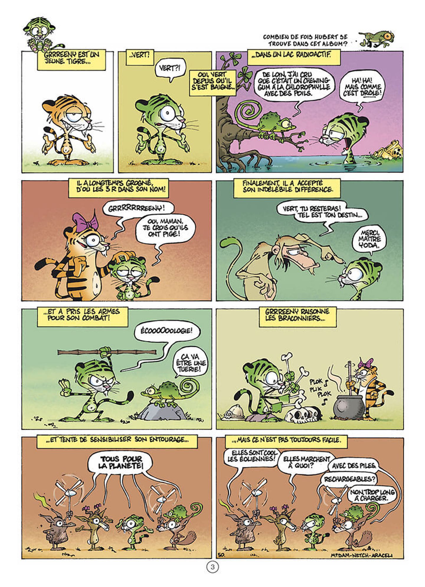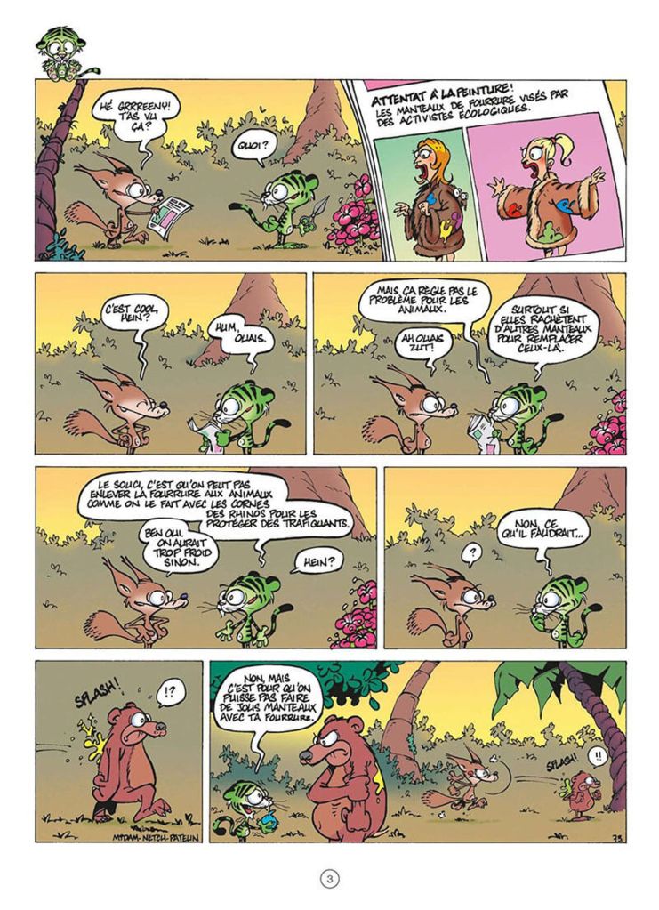 Quand Grrreeny était petit, il s’est baigné dans un lac radioactif. Depuis, il est devenu tout vert, d’où son nom. Son père grogne dans la jungle pour montrer son mécontentement. Lui ne veut pas se limiter à ça. Donc avec ces potes de la jungle, il fait plus et va plus loin. Quand des braconnier débarque et ils lui règlent son compte. Pourquoi les animaux ne pourraient pas se délecter de sa viande et utiliser sa peau pour faire des objets? Bien que cela s’adresse à des enfants, les scénaristes ne font pas dans la demi-mesure. Mais tout n’est pas de cet acabit. On reste sur quelque chose de classique avec une page et un gag. Les références à des catastrophes écologies sont nombreuses comme le réchauffement de l’eau, la pollution, l’essor du plastique, la surconsommation… Parfois pour faire bouger les lignes, il faut toucher ce que les gens aiment plus que tout comme le football. « Manifestation contre la déforestation. La forêt est massacrée. A chaque seconde c’est la surface de 3 terrains de foot qui disparaît. Bougez-vous. Venez nombreux ». Les codes sociaux et les clichés sont très bien maitrisés. Les enfants peuvent très bien comprendre les gags tout comme les adultes. D’ailleurs, une lecture familiale est chaudement recommandée. Vous pourrez discuter de l’importance de la biodiversité et de ce qu’est l’écologie. Le mot est souvent pro. Un sujet pas si banal qui mère bien quelques interrogations. Au moins, il ne sera pas nécessaire de mettre la tête d’un chasseur empaillé dans votre salon.