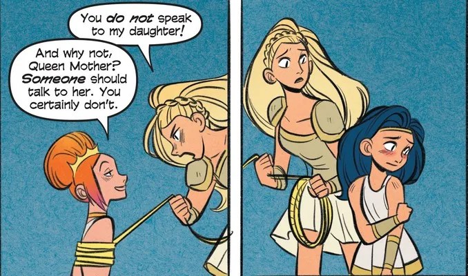 Quand on dit Diane et amazone, vient tout de suite à l’esprit l’image de Wonder Woman. Beaucoup se souviennent surtout du micro short et du haut sans manche mettant en valeur sa poitrine. Une héroïne inventé par des hommes pour des hommes. Mais là, messieurs n’ouvrez pas la fermeture éclair de votre pantalon. Nous allons en effet sur l’île des Amazones pour rencontrer Diane, petite fille. Le comics s’adresse à un jeune public. La princesse porte des tenues plus couvrantes et aussi très pratiques. Malgré son jeune âge, elle est déjà très douée. Toutefois, elle ne peut pas aller s’entraîner avec les autres amazones. Elle ressent souvent un profond sentiment de solitude. Puisque son histoire serait qu’elle est née avec de l’argile, pourquoi n’essaierait elle pas de se faire une copine de jeu? A sa grande surprise, elle y arrive. Au début, tout est génial. Très vite, elle est incitée à faire des bêtises de plus en plus importantes comme ouvrir la porte aux monstres. Circé est une fine manipulatrice très habile. Au final, elle se fera prendre. N’oublions pas que nous sommes dans un récit très dichotomique. Donc à la fin, les gentils gagnent et Diana se rapproche de sa maman.