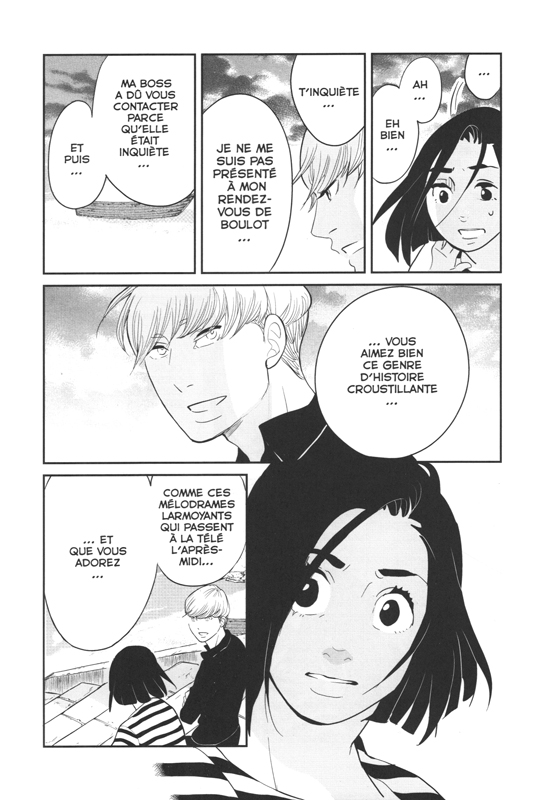 Les choses se passent comme prévu. Rinko rencontre Key. Un peu de tranquillité à deux pour permettre aux mots d’être libre. Après quelques reproches, il faut agir. Voilà qu’il embrasse la demoiselle plus très fraîche et vont faire l’amour. On pourrait croire qu’enfin tout est réglé. Mais au final, il y a eu peu d’échanges. Et puis l’approche d’Akiko Higashimura est assez tirée par les cheveux. Le gars est tombé amoureux lorsqu’il était enfant de son médecin. Elle était jeune et très jolie. Normal qu’il soit sous le charme. Que savent les enfants du sentiment amoureux? Rien. A 18 ans, elle lui apprend qu’elle va mourir bientôt et qu’elle n’a pas concrétisé son rêve de se marier. Par conséquent, il l’épouse. N’est-ce pas un peu trop poussé loin le cliché trop facile? On se croirait dans un scénario de télénovela bas de gamme. La cerise sur le gâteau est que Rinko ressemble à sa femme et à le même âge quand elle est morte. Tellement de hasards trop facile qui rendent la vraisemblance totale improbable. Donc on se réjouit qu’il ne reste plus qu’un tome devant se conclure par un happy end. De surcroit dans ce tome, l’histoire est plus courte pour laisser de la place aux échanges avec d ya qu’à faire ci, faut qu’on fasse ça. Cela n’a pas vraiment de lien avec nos héros de papiers. Est-ce une façon de publier un album de plus pour gagner un petit peu plus d’argent de la part de l’éditeur? On se pose la question.