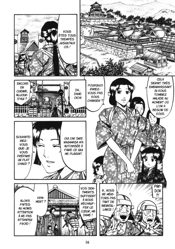 L’importance de ce tome repose sur la présence des femmes. Certes, elles ne sont pas soldats. Mais elle ne serve pas à rien non plus. Malgré leur statut d’inférieure, elles savent montrer des savoirs faires non négligeables aussi bien dans la politique, l’espionnage et bien entendu la cuisine. Ainsi on retrouve la soeur de Nobunaga avec ses enfants qui prêtent à mourir pour l’honneur de son mari. Normalement, quand il se fait seppuku la femme doit suivre. Grâce à Ken, une alternative est trouvée pour que les enfants puissent grandir avec la présence de leur mère et l’esprit de leur père. Il faut du tempérament pour accepter cela et avancer dans la vie. On nous montre aussi des femmes plus ordinaires qui elles aussi sont importantes. L’épouse d’Hideyoshi lui a permis une ascension sociale en lui donnant son nom de famille. Elle le soutient à sa manière dans sa progression sociale. Grâce à Ken qui lui a donné un cours de cuisine, elle a préparé un met d’une grande savoir et d’une grande signification. Une approche très appréciable et assez rare de le lire dans de nombreux mangas. On finirait pas croire que l’Histoire ne s’écrit que grâce aux bonhommes. La fin du tome nous promet des rebondissements palpitants par la suite avec l’affrontement indirect avec Ken’Nyo, le moine guerrier, représentant du dernier gros clan ennemi. Il va falloir parer en bonne intelligence pour éviter des complications aux impacts non négligeable.