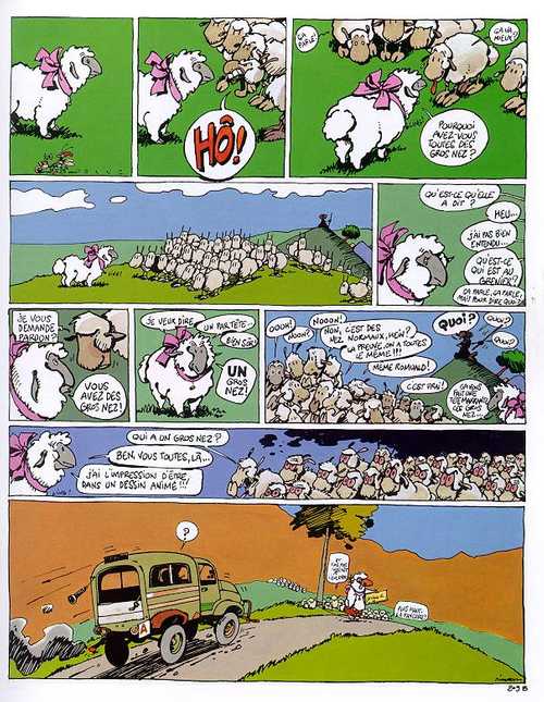 Pour faire une parenthèse dans le 9e art rien de tel qu’une plongée dans un album de F’murrr. Un voyage dans une autre époque, une autre façon de pensée et dans une folie douce amusante ainsi que déroutante. Dorénavant, nous sommes habitués au gardien de moutons, son chien et les moutons. On assiste à de grandes discutions sur la dialectique peut-elle casser des briques; le berger et la brebis Tranxenne qui dépriment; une nouvelle arrivante avec « Tombédcamione » qui « suffolke » et qui a la picole facile; elles doivent faire face aux affres de l’administration et des règlementations absurdes… Avec tout ça, on a le droit toujours à des références philosophiques, littéraires et politiques. On trouve même des références au nucléaire. Par exemple, une montagne s’ouvre en deux car dedans se cache un abri anti-atomique. L’aigle est présent et ne manque pas que de simples ovins. Un décalage appréciable qui montre que les limites de l’absurde n’existe pas. Seul notre imaginaire est capable de créer ce genre de création.