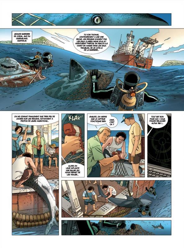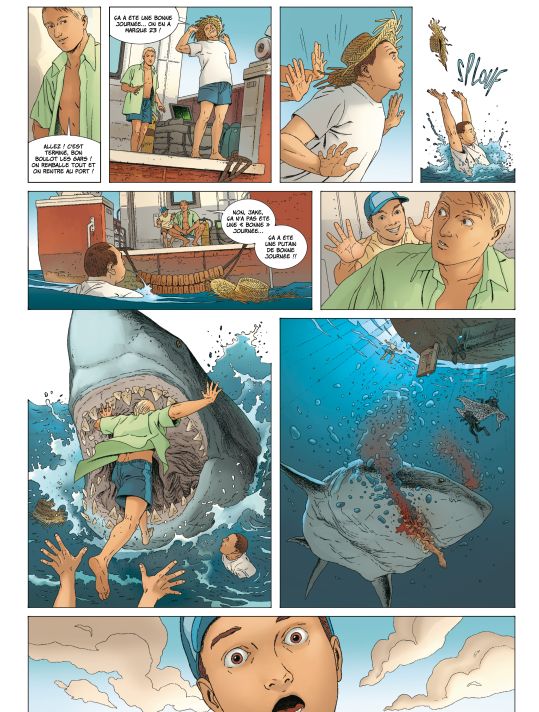 Quand on ouvre la bande dessinée, on voit tout de suite que le graphisme est différent. C’est normal puisque Milan Jovanovic a pris la place d’Eric Henninot. Le trait reste assez standard pour ce genre de série que l’on retrouve dans « XIII » ou « Largo Winch ». Le dessin est tout de même plus léger et plus agréable à lire. On sent le dessinateur plus à l’aise à dessiner ce qu’il y a sur terre et moins dans l’eau. Par contre, il joue à merveille avec le cadrage. D’ailleurs, on reste saisi un instant par le moment où un enfant pousse son père dans l’eau. Et il tombe direct dans la bouche d’un requin géant. L’animal n’en fera qu’une seule bouché. Le gamin est traumatisé à vie. L’autre scène montre Lou, la petite fille avec des branchies, qui caresse le nez du mégalodon à grande profondeur. La bestiole a eu peur et a broyer avec sa mâchoire le submersible individuel avec son passager. Un être étrange qui va attirer l’intérêt de milliardaire à l’avenir. Comment pourrait-il en être autrement?
