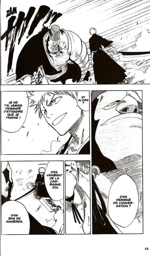 Le tome commence assez vite dans l’action. Il ne fallait pas s’arrêter d’avancer. On peut se demander si le chat Yoruichi savait qu’il y avait un camion de nettoyage hebdomadaire, pourquoi il n’a pas pris cela en compte? Même s’il ne connaissait pas la date de passage, pourquoi n’a t’il pas prévenu du risque possible? C’était la première occasion de voir comment le groupe fonctionne ensemble. De toute façon, il n’a pas le temps de s’ennuyer. Après il faut affronter celui qui garde la porte d’accès au premier niveau. Les choses se passent en devant mener des combats. L’occasion pour Ichigo Kurosaki de montrer ces compétences hors du commun. Par contre, il est de plus en plus impulsif et démarre au quart de tour. Normal puisqu’i est censé avoir 15 ans, malgré un physique d’adulte. Il se prend la tête avec un gars qui déteste les shinigamis. Il a une réplique percutante : « Espèce de tête de pissenlit ». Sans oublier les déformations de son visage lié vraiment au comique. N’oublions pas que c’est censé être à destination des adolescents masculins. Ce qui explique aussi que l’on a le droit à des plans sur des mégas grosses poitrines. Surtout avec Kûkaku l’artificière manchote. C’est important de cultiver la perversité chez les plus jeunes. Pour préparer à la suite, nous avons un bref aperçu de ce qui attend Rukia. La date de sa mise à mort a été avancée. Quelqu’un s’interroge sur les raisons d’un tel traitement pour une personne de si bas niveau. Le soul society est aussi soumis à la corruption, la gestion de privilège et la discrimination. Qu’est-ce que cela cache? Ses amis arriveront-ils à temps?