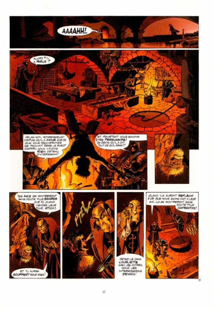Nous sommes bien loin de la nature et de sa défense des premiers tomes. Dorénavant, nous voilà dans une autre dimension avec l’omniprésence du religieux et des robots. Par conséquent, les couleurs sont plus sombres. D’autant plus, que nous allons arriver dans une période conflit. D’un côté, le cardinal Cantor qui tient tout d’une main de maître. Il possède une fortune à rendre jaloux Picsou et des œuvres d’art à faire pâlir le Louvre. Un petit faux pas et tout est chamboulé. Grâce aux robots devenus illégaux, des rejetés et bien entendu de Nao avec ces potes un nouveau monde s’annonce. L’équipe de nos héros que l’on suit depuis le début passe un peu au second rôle. Nous assistons plus à une guerre des robots. Outre par l’image, cela est souligné par le vocabulaire : droïdes, mécarebelles du front cybernétique, cybermécanicien, robonurse, loi anti-droïdes, innocentes machines, pièces détachées, bloc propulseur, blocs mémoire, rézoconseil, supercalculateur en réseau… En plus, la plupart de ces mots sont en gras. Difficile de passer à côté. Espérons que cette insistance aura un sens pour le reste de la série. Car au niveau scénario, cela reste assez classique sans vraie surprise. On en vient même à oublier le but du voyage de Nao et ses amis.