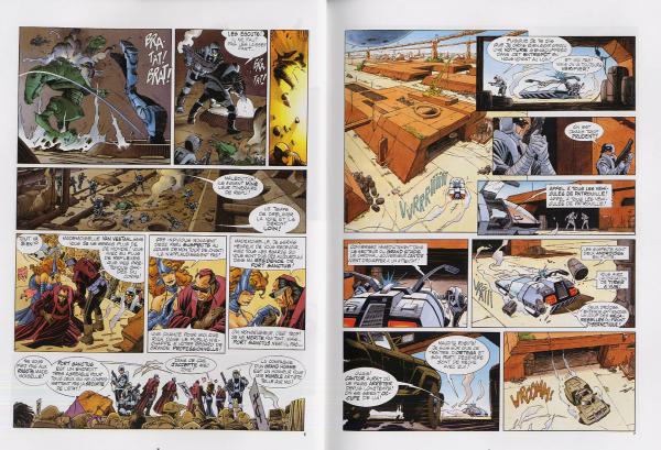 « Il n ‘y aurait pas de machines sans hommes, c’est évident… Mais il n’y aurait pas d’hommes sans machines non plus. » (p. 25) Thierry Cailleteau va même jusqu’à introduire une femme robot qui ressemble à une humaine. Cette machine ne surprend personne bien au contraire. Les hommes assez binaires rêvent de coucher avec elle. Ciro Tota choisit de la représenter pour flatter le lecteur mâle. Donc elle est ultra-mince, blonde à cheveux long, une grosse bouche et surtout une énorme poitrine. Un conformisme de représentations présent dans tout l’album qui va jusqu’au nombre de pages bien précise. Néanmoins, on trouve des éléments assez intéressants. Par exemple, les robots pour avoir un lieu où vivre efface la mémoire relative à un lieu et une autre culture. Il n’est pas si difficile aussi de construire une Histoire, un récit collectif. Celui qui maîtrise les données, maîtrise l’image du passé et celle de l’avenir. Par contre, on peut se demander si le peuple se révolterait si on prouve que le dictateur est un malfrat. Qui pourrait vraiment en douter? Le responsable de l’armée n’obéirait plus car il a la preuve que son supérieur est malhonnête, vraiment? Ce n’est pas du tout crédible. La vraisemblance psychologique n’est jamais un critère nécessaire surtout pour la SFFF. On va poursuivre l’aventure en espérant revenir un peu aux origines et de retrouver l’angle écologique. Espérons que cette période de remplissage finisse par laisser la place à du contenu plus en lien avec la quête primaire. Nous le saurons prochainement.