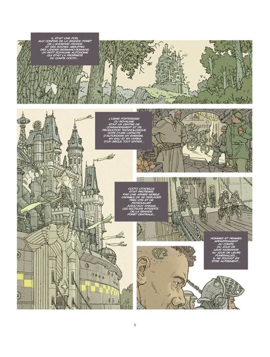 Le scénario fait des références à l’actualité. On parle d’économie : « Le cours du bois énergétique risque de flamber mon cher Cocto. La banque centrale féodale est solide, en cas de crise, elle amortira les fluctuations… » (p. 19). Le futur avec des caissons de récupération médicale montre que la santé a évolué et plus efficace. On peut même se réparer avec des organes aux choix. Toutefois, on ne sait pas trop comment ces derniers se fabriquent. Les traces du passé restent conservées par quelques uns comme des voitures et surtout un char d’assaut avec son armement. Ces éléments vont réintégrer l’envie de profit à tout prix. « Notre chaufferie à bois permet d’alimenter en énergie les 5 000 âmes du comté, nos élevages et nos laboratoires. La citadelle en revanche, possède sa propre unité de production d’énergie. […] Le choix du bois est-il judicieux à long terme? Cela reste une ressource épuisable et qui rejette des impuretés… […] – Les réserves de néoforest sont mathématiquement inépuisables tant que nous contrôlons les naissances humaines et animales chère amie… » (p. 60). Et une revanche terrible se déploie : « Je crois que la forêt ne veut plus des hommes et qu’elle apprend à tuer ». Tout est bien amené avec une démarche manichéenne plus nuancée. La forêt n’est pas un sujet passif qui subit.