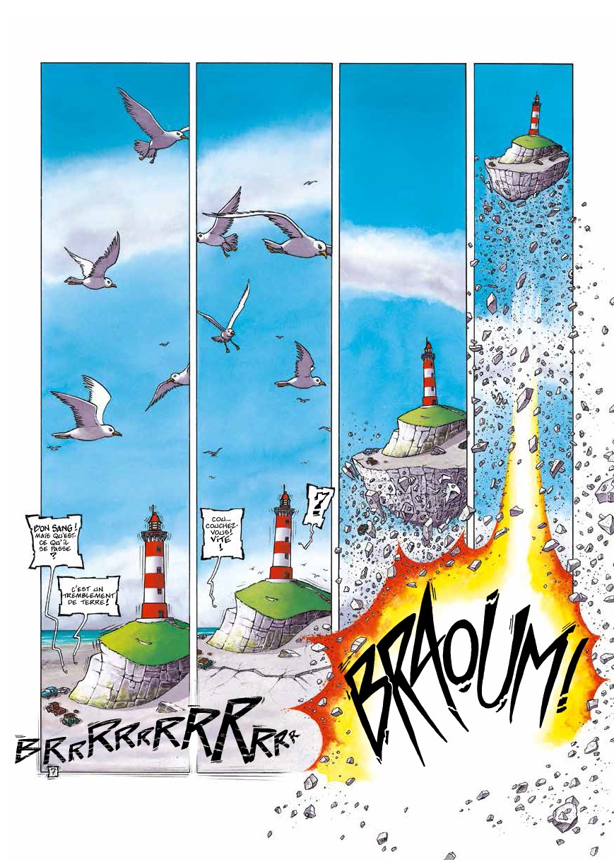 On aurait pu croire que le récit d’un phare qui explose et s’envole dans l’espace aurait pu rattraper le reste. Mais pourquoi ça? C’est déjà absurde en soi. Il n’est pas question de logique non plus, puisque cela paraît logique de pouvoir respirer en dehors de l’atmosphère. Alors pourquoi pas pouvoir recevoir des appels? Tout est sans queue ni tête. Ce n’est pas les quelques références scientifiques ici et là qui donne plus de consistance. La seule satisfaction est quand on arrive à la dernière page. On se dit, chouette je vais pouvoir enfin la déposer dans une boîte à livres. Et surtout, il est hors de question de se plonger dans la suite. Il y a tellement de choses intéressantes à lire que parfois des albums ne méritent pas qu’on leur consacre du temps.