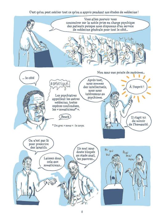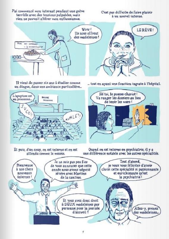 Claire Le Men partage un moment de sa vie à travers son alter égo : Lucille Lapierre. Elle est en école de médecine. Pour avoir son titre de docteur, elle doit faire un stage de 6 mois dans un établissement. Elle a choisit de travailler dans une structure avec des patients dangereux qui ont tué des membres de leur famille ou des proches. Bien entendu, aucun ne se considère comme un meurtrier. Son boulot consiste à les faire parler, les écouter et leur faire prendre des médicaments pour réduire leurs troubles. Quand enfin, ils se rendent compte qu’ils sont des criminels, on considère qu’ils sont normaux. A eux de vivre avec leur culpabilité dorénavant. Elle doit jouer le rôle du docteur alors qu’elle n’a pas le titre. Cela l’a met mal à l’aise et donc ressent le sentiment du syndrome de l’imposteur. C’est tout. Le reste, on a le droit à une explication de long en large de la gestion de ces fous. Aucun doute que cela est très intéressant pour ceux qui s’intéressent à ces souffrances qui inspirent nombreux films et émissions spéciales meurtriers. La folie fait toujours recette. On accepte moins qu’un fou tue qu’une personne saine cognitivement. Ce n’est pas facile tous les jours mais elle y arrive. Tout ça sert de base à la bédéaste qui quittera le milieu pour se consacrer au 9e art.