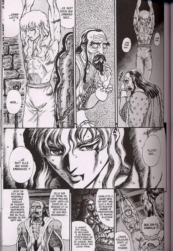 Pour atteindre son objectif, Griffith passe à l’étape suivant. Un soir de pluie, il rentre par la fenêtre de la chambre de Charlotte. Il lui fait l’amour en ayant en tête Guts. Kentaro Miura insiste sur cette scène et prend son temps dans la description pour illustrer le plaisir et la souffrance en même temps. Une façon aussi de constater plus amplement la difformité des corps mis à nu. Ce n’est pas un choix pour créer de l’inconfort. C’est le style graphique du mangaka comme nous l’avons vu précédemment. Choisir le sexe a des conséquences sur l’avenir. Griffith se fera prendre par le roi qui devient fou. Lui préservait sa fille pour pouvoir coucher avec elle. L’idée de viol sur mineur et d’inceste a quelque chose de dégoutant. Surtout qu’il va essayer d’abuser de sa fille. On aura des plans sur son regard fou et vicieux. Il touche le corps de sa progéniture, lèche un téton, regarde son vagin.. C’est ignoble et d’une grande violence.