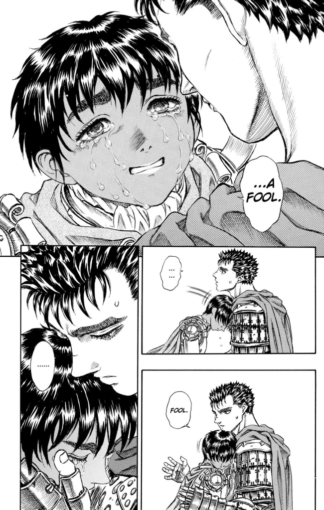 Après avoir considéré durant ces trois années que sa place était au sein de la troupe du Faucon, Guts décide de faire cavalier seul. Fatigué d’être la face cachée d’un Griffith resplendissant, il part se ressourcer, cherchant à gagner quelque chose de ses propres mains pour remporter une victoire personnelle. Mais Griffith n’a aucun désir de laisser partir Guts et tente de le retenir par tous les moyens, le provoquant en duel comme de leur première rencontre, il y a trois ans de cela. La victoire de Guts en un coup est écrasante : le voici à nouveau libre. Pour Griffith, c’est le début d’un long effondrement émotionnel.