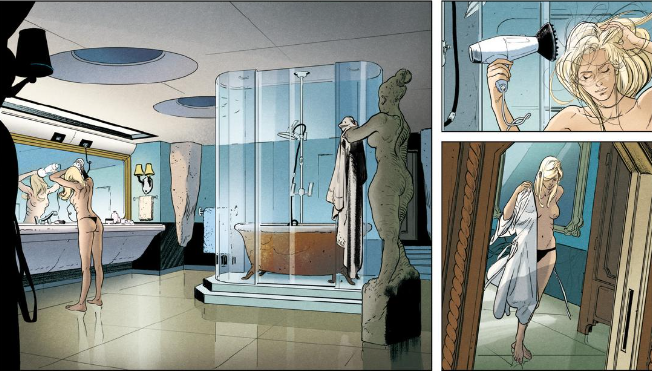 On ne pourra pas dire que le scénariste ne nous pas d’informations. Mais l’impression d’en avoir trop sur tout est prégnante. Heureusement que nous n’avons ici que 56 pages car sinon, on aurait du faire de nombreuses pauses pour tout digérer. Impossible de ne pas avoir la sensation de remplissage. Est-ce si utile de parler du changement climatique en introduction? Tout ne sert à rien dans le récit par la suite. On ne va pas lister tout ce qui semble en trop. Graphiquement, on rencontre le troisième dessinateur : Ennio Bufi. Lui aussi à son univers qu’il affirme ici avec un style toujours précis et réaliste. Il apprécie le nue. On voit Lou souvent nue, en bikini, avec des vêtements transparents… Le lectorat masculin sera ravi de se rincer l’oeil. Parfois, c’est bon de revenir à ces basiques d’une autre époque. Du moins pour certaines personnes. Espérons que la suite sera plus construite.