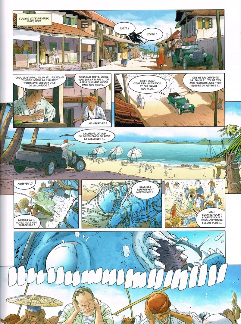 Tout commence sur le mythe de l’Homme poisson. Direction, l’Inde en 1938. « Monsieur Zoete, venez voir sur la place!… On a pris quelque chose dans nos filets… Une créature! C’est vivant, c’est pas un poisson… et pas humain non plus… ». On voit un corps d’apparence humaine à quelques détails prêts. En 1879, des marins de la navy ont vu des choses lumineuses passés sous leur bateau. « Les ondes de lumière s’étendaient de la surface aux profondeurs marines!… ». Puis voilà que le méga El nino change encore les choses. « L’influence d’El Nino touche la planète entière!… De terribles pluies et inondations ont ravagé tout le front est du pacifique tropical…! L’Océanie doit faire face à des sécheresses meurtrières et de gigantesques incendies de forêts!… » Partout le bilan est identique. « Toute activité de pêche est désormais stoppée en Amérique Centrale… le nombre de saumons a grandement diminué, ils sont maintenant menacés d’extinction totale… Les récifs de corail dans l’océan sont toujours en train de mourir!… Le nombre d’ouragans dans le centre pacifique a augmenté radicalement, frappant également la côte de l’Ouest de l’Australie… Le récents travaux des paléo-climatologues, à partir de sédiments et de traces sur les arbres, ont déterminé qu’il y avait déjà eu des mégas dérèglements dans les millénaires passés… ». Les experts discutent pour essayer de comprendre ce qui se passe. « – Les fortes hausses de températures relevées dans les océans cette dernière décennie auraient dû nous alerter!… – L’humanité est entrée dans un cycle terrible qu’elle a elle-même engendré! La nature réagit toujours avec une violence insoupçonnée!… ». Nous n’aurons plus rien en rapport avec cette approche par la suite. Faut-il y voir une façon de surfer sur un sujet tendance?