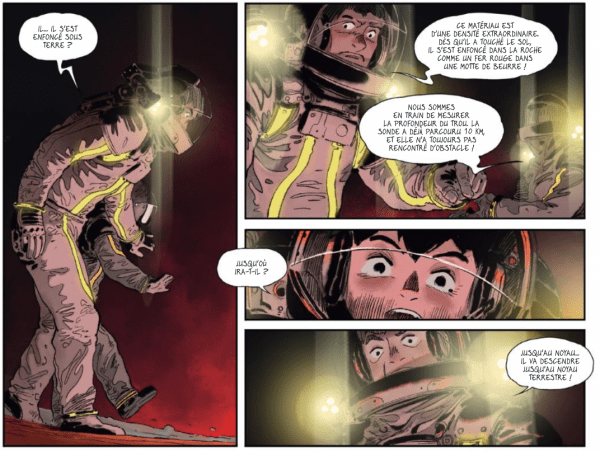 Le graphisme est net, précis et très lisible. Même approche pour la mise en couleur, qui joue avec le sombre et la lumière. On passe des zone assez marron et noir, l’ensemble assez nuancé pour inspirer le danger et le risque. Et de l’autre, on va avoir du rouge éclatant même si c’est souvent lié à la catastrophe. Sans omettre, la blancheur pour la lumière à la fois symbole de l’innovation et de la découverte. La pression, le doute et le deuil se ressente même si l’on ne lit pas les bulles. Le fait de garder les prénoms chinois est risqué pour un lecteur occidental qui n’est pas habitué à ces sonorités. Gentiment, le traducteur a rajouté des notes de bas de page pour comprendre les structures et les niveaux de hiérarchie. La forme très classique ce qui va ravir les fans de la SFFF. Un choix aussi valable pour la série « Les futurs de Liu Cixin ». N’oublions pas aussi que la question écologique reste toujours présente. On évoque les effets de la bombe nucléaire qui engendre la souffrance et la misère. Et aussi les dégâts environnementaux engendrer par la quête d’un supra-matériaux et de ces conséquences à long terme. Le monde n’est-il pas foutu? Il faut croire que non.
