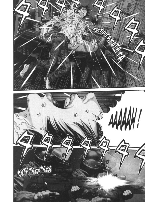 Hiroya Oku jour avec ces lecteurs concernant Hiro. Il passe d’un sociopathe à un adolescent normal pour redevenir un sociopathe. Shion et sa mamie se font abattre comme des bêtes pour la police qui va direct à l’efficacité. Par conséquent, la police doit payer pour ces actes. Hiro arrive à leur rendre la vie mais ce n’est pas suffisant. Il se rend dans un commissariat et tue tout le monde à une exception. Les cadavres s’accumulent par centaine. Puisque les représentants de la loi refuse de le laisser en paix, il va tuer des individus. Au début, 100 choisis un peu au hasard mourront. Puis après, c’est la déclaration de guerre envers le Japon. L’escalade a bien été progressive et explosive. Le mangaka en profite pour bien montrer cette violence où l’on voit l’entrée des impacts de belles et des coulures du sang qui émergent des blessures. Ames sensibles passez votre chemin. La suite risque d’être encore plus sanglante. D’autant plus que l’annonce d’une astéroïde pouvant détruire le monde. Y a t’il un lien entre les cyborgs et ce caillou de l’espace? Ou y aura t’il un lien puisqu’ils peuvent aller dans l’espace et dévier l’objet? Est-ce qu’il y aura une intervention d’extraterrestre? Ou n’y aura t’il rien de cela puisque les Américains vont s’occuper de tout? On le saura assez tôt.