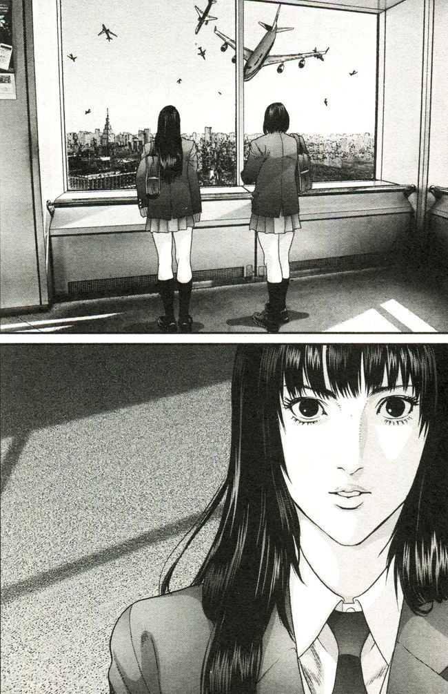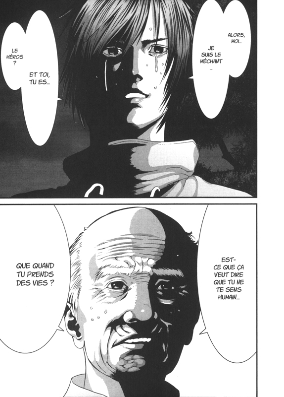 Comme prévu, Hiro fait monter de niveau l’horreur. Assassiner 100 personnes quand il peut toucher ces cibles à travers des outils numériques, c’est facile. Les gens qui parlent au téléphone ou qui regardent les écrans publicitaires géants ne manquent pas. C’est pour ça qu’il ne tardera guère à arriver à son quota. Pour les lecteurs qui n’aiment pas voir des cadavres et des éclaboussures, passez votre chemin. Ici les pages avec ça sont légions. Heureusement que l’ouvrage est en noir et blanc. L’image laisse plus de place au texte. Pas besoin de commentaire pour comprendre. Pour l’objectif suivant avec 1 000 personnes, il prend une nouvelle tactique en faisant tomber des avions du ciel dans la ville. Il pleut des avions. On pourrait dire qu’Hiroya Oku reste dans l’image assez standard avec des tueries de masse soit dans une avenue très passante comme celle vue régulièrement pour montrer Tokyo ou des attaques d’avion. Shion fait son apparition en lui demandant d’arrêter le massacre. Il est passé de nouveau en mode je me sens vivant en assassinant. Et Inuyashiki pointe enfin le bout de son nez. Il arrive à poser des avions. A cause de ça, la rencontre entre les deux cyborg se réalise enfin. Bien entendu, schéma classique avec d’un côté le gentil et l’autre le méchant. Est-il possible de voir les choses autrement dans cette situation? Et qu’en est-il de l’astéroïde? Il a totalement disparu? Le papi pourra t’il aussi sauver sa fille piéger dans une tour? On garde l’impression que le mangaka fait traîner les choses encore et encore. Cette sensation gâche un peu la lecture. On verra ce que nous réserve les trois derniers tomes.