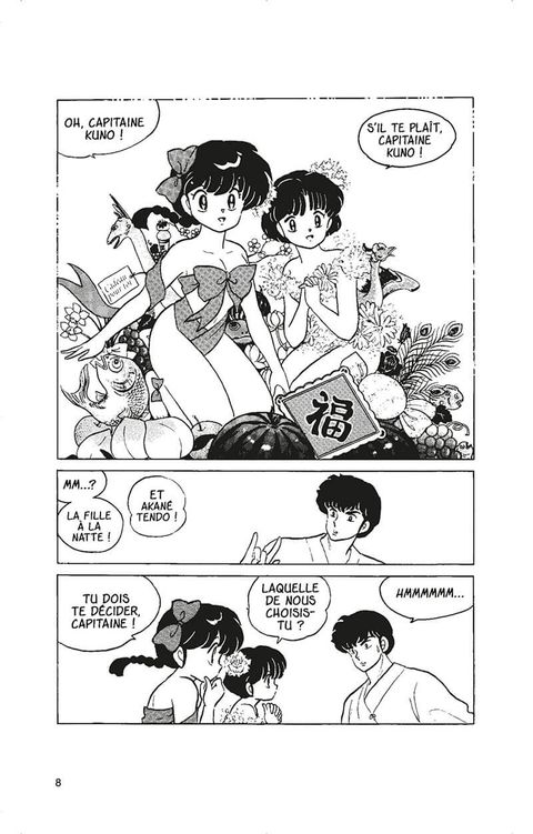 Ranma n’a jamais de temps pour se reposer. Ce n’est pas pour rien que c’est le personnage central de Rumiko Takahashi. Il utilise l’adolescent pour montrer à la fois des combats, des filles nues et des situations cocasses. Deux récits nous permettent de retrouver tout cela. Le premier avec Kubo qui hésite entre deux filles. Il voudrait ne pas choisir et être un pacha. Un concours de circonstances va faire de lui qui choisit la gagnante d’une course. Les demoiselles se battent pour lui faire gouter leur plat en livraison car c’est cela qui déterminera la suite de leur aventure. La drôlerie se trouve au rendez-vous car chacune use autant de son charme que de leur intellectuel. On n’a pas le temps de s’ennuyer un seul moment. Surtout que le mangaka va s’amuser à changer Ranma en fille et en garçon selon les situations pour renforcer l’incongruité.