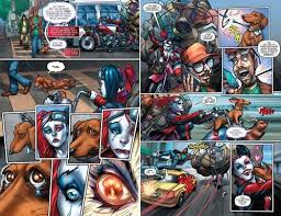 Urban Comics et DC publient à un tarif très avantageux les aventures d’Harley Quinn. Certaines personnes la connaissent grâce à des films dont un sur son personnage. En effet, elle a le physique pour plaire au regard vicieux et pervers de ces messieurs. N’oublions pas que c’est par des hommes et pour des hommes. Donc elle est très mince, avec une grosse poitrine, des cheveux long et les yeux bleus. Suite à un bain prolongé dans un produit toxique, sa peau a été dépigmentée en blanc. Son ex était le Joker. Elle ne se soumet à personne et ne dépend pas d’un homme pour vivre. Et pour se défendre, de tous ceux qui l’attaque, dans le pire de cas, elle les tue. Et c’est toujours avec beaucoup de délicatesse soit en leur tirant des balles dans le corps, les découpant, les décapitant… Les cadavres ou des bouts de corps s’accumulent un peu partout.