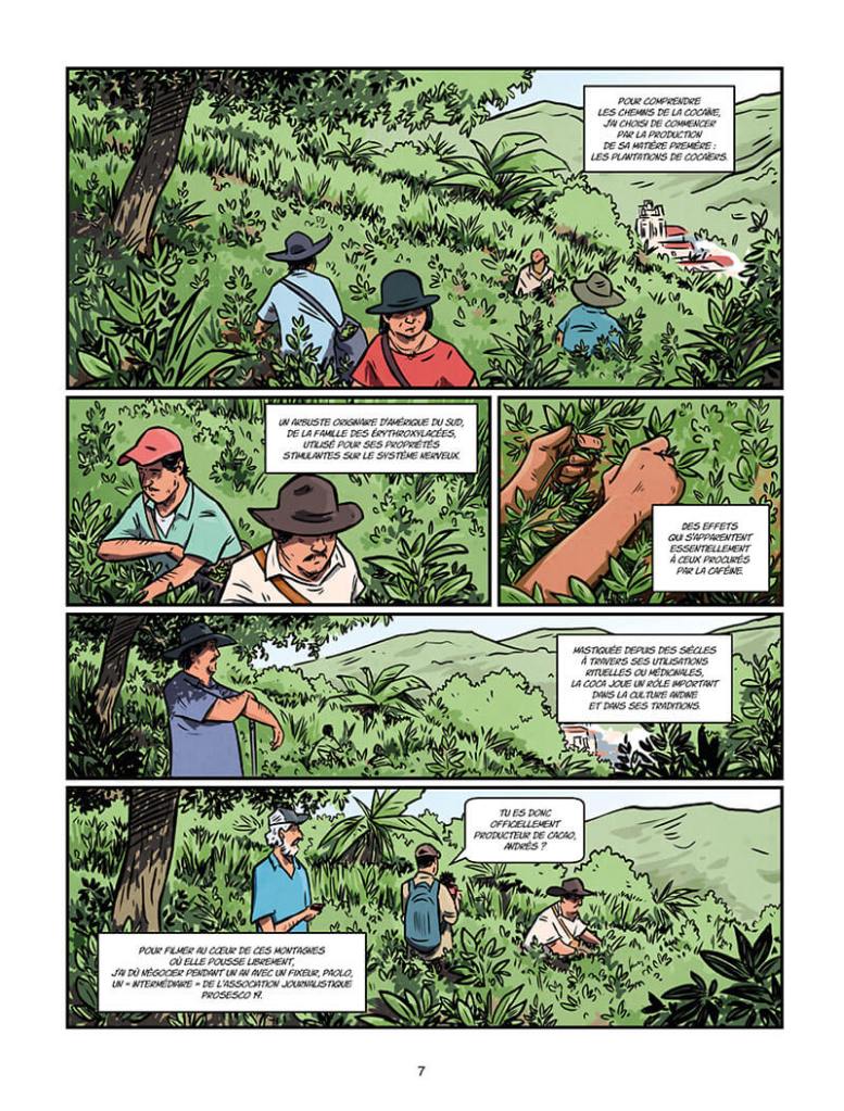 L’enjeu de l’album est de voir au-delà du côté sexy que véhicule des séries, des films et même des documentaires. La réalité du terrain est tout autre. Sur place, en Bolivie, Mexique, il discute avec les récoltants, les vendeurs, les acheteurs, les dealers, les familles de ces individus… La pauvreté incite les gens à faire n’importe quel métier pour survivre et protéger leur progéniture. Parfois l’argent facile fait perdre la tête. Le risque de se faire prendre ou tuer semble totalement dérisoire. C’est toujours sur les autres que ça tombe. Sauf quand c’est sur soi. On voit l’ensemble de la chaîne à part les consommateurs occidentaux. Dans le témoignage en Afghanistan, on constate une pression encore plus dure avec les intégristes qui tiennent toute la société. Ils utilisent la religion pour appliquer une violence cruelle et sauvage. Oser faire autrement est une prise de risque énorme. En ne cultivant que la drogue, les populations n’ont plus de quoi se nourrir. L’argent pousse à l’excès, la haine et à l’inhumanité.
