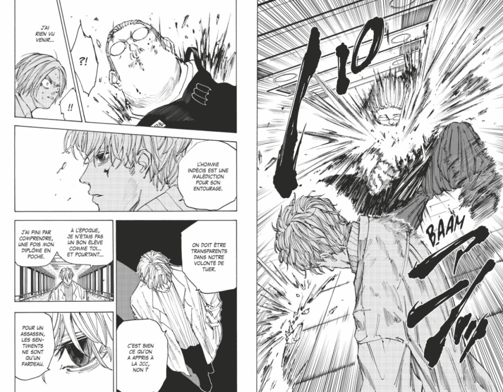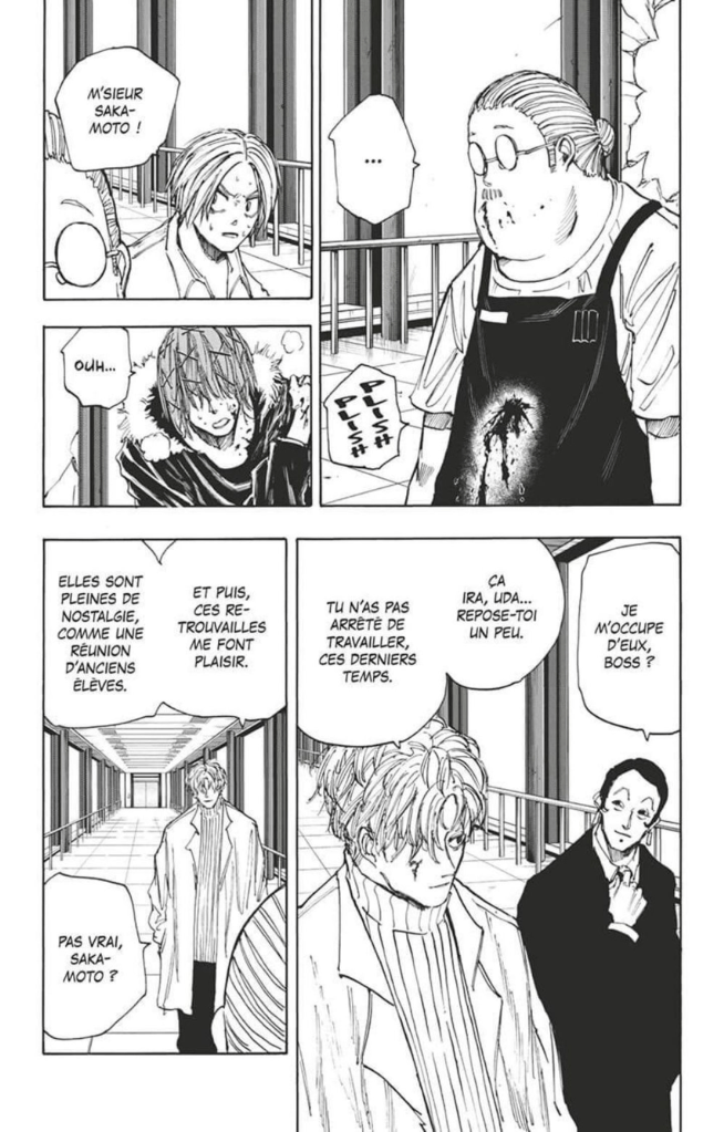 Yuto Suzuki passe un cap dans sa série. Dorénavant, la violence est omniprésente. On a écrémé les tueurs les moins bons. Là, on a la crème de la crème. Précis, calme et doué, Slur rivalise avec Sakamoto. Quand il promet de tuer ses amis et sa famille, l’ancien assassin s’énerve. Mais l’arrivée d’un vieux hyperdoué casse la dynamique de leur combat. Le mec est incroyable et époustouflant. Un ennemi aussi qu’il ne faudrait pas se mettre à dos. Même si l’on ignore encore son identité, on sait qu’il va avoir un rôle à jouer par la suite. Le mangaka en profite pour nous montrer des scènes de lutte d’une grande précision. On en prend pleins les mirettes.