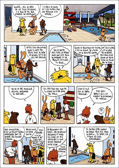 Après les Formidables Aventures sans Lapinot, revoilà les aventures non moins formidables, avec Lapinot et ses copains. L’affaire commence à la piscine, où Richard refuse de mariner dans un truc qu’il suppose très chargé en morve et en glaires. Amis de la poésie, bonjour. Après s’être fait virer pour conduite infantile, ils vont manger – sept secondes de piscine, ça creuse – et retournent vaquer à leurs occupations en attendant la soirée chez Nadia. Lapinot voudrait bien « amorcer quelque chose » avec Nadia, et aussi, trouver du travail pour s’installer en ville.