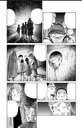 Naoki Urasawa ne va pas donner toutes les informations d’un coup. Ce n’est pas le genre de la maison. Par conséquent, nous avons le droit à un voyage dans le temps. Otcho se remémore son passé derrière le mur. Ami s’amuse à faire disparaître la société en les incitant à s’entretuer. Des gens avec un masque à gaz dépose un vaccin à un individu ou une famille. Pour l’avoir tous les autres sont prêts à tout comme tuer sans vergogne. En ayant le médicament, ils ont une chance de revoir leurs proches derrière le mur. La mort se répand partout par la folie qui touche les individus. La solidarité, le partage, la bienveillance deviennent des utopies. Comment croire encore en l’humain après ça? Otcho a bien du mal. Et son voyage ne lui a guère permis de modifier son opinion. Son attitude aura t’elle un impact sur la suite? Nous voilà encore titiller pour en savoir plus. A chaque dernière page, on se rapproche de la fin. Qu’est-ce qui va nous être dévoilé?
