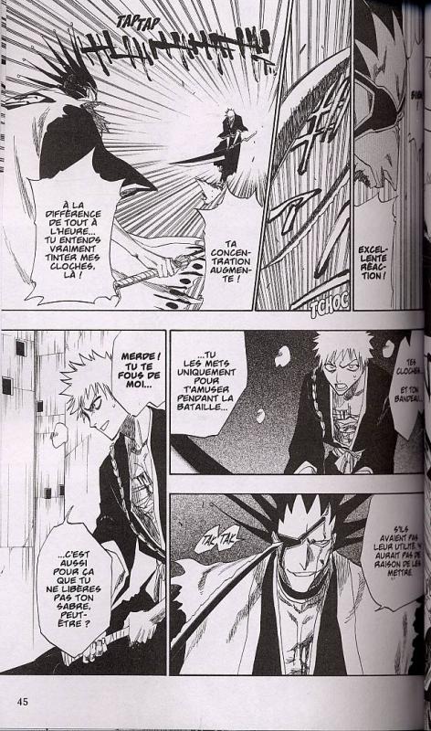 Ichigo se fait laminer par son adversaire. Dans une sorte de coma, son arme vient lui parler. Zangetsu le confronte à son hollow intérieur pour lui permettre de se révéler à lui-même. Ensemble, ils peuvent y arriver. D’un coup, à son réveil, il est un autre et botte le cul à Zaraki. les voilà tous les deux HS. C’est la première fois pour le capitaine et il est ravi de cela. Il a hâte de remettre ça. Du moins, quand ils seront de nouveau en aptitude de se confronter. Tite Kubo propose des scènes de combat dynamiques et pleines de rebondissements. On ne s’ennuie jamais. D’autant plus qu’il intègre un nouveau récit avec Ganju et Hanatarou arrivent enfin à la tour où est retenue Rukia. Seulement voilà Ganju fait face à celle qui a tué son frère. Il veut se venger. Kuchiki Byakuya débarque avec un calme olympien ce qui n’annonce rien de bon. On sait ce que nous réserve la suite et nous avons hâte de la découvrir.