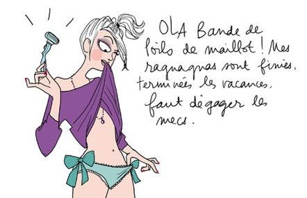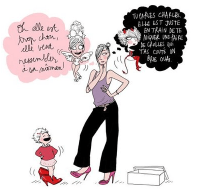 Elle évoque toujours avec une succession de gags des sujets relatifs à sa vie de maman, d’épouse et de femme. Donc par conséquent, on parle de règles, d’épilation, de coiffure, de chaussures, d’achats compulsifs, de moins bonne gestion de la picole… Plus on vieillit et plus c’est difficile de gérer les gueules de bois. Par contre, on n’est pas forcément plus mature quand il est question de chaussures surtout de marque. La raison passe à la trappe face à Louboutin. Néanmoins, elle ne se prend pas une princesse. Elle est vraie avec ces choses que l’on fait ou dit en tout discrétion ou intimité. Pas de sujet tabou : on parle de prout et de poils récalcitrants. Toujours avec un humour décapant et absurde. Qui n’aimerait pas répondre à son gamin qui n’arrête pas de appeler sans bouger son popotin pour une broutille : « Maiiis looaaaaaaaaaaaa bordel à queue de pine, tu me caaasses les couilleuh, tu veux que je fasses une dépression nerveuse putain de booordel, j’ai une vie, moi aussi, je suis pas Super Nanny! Fuck de chiotte de merde! ». Comment résister à cela? Qui ne l’a jamais pensé même en rapport avec son supérieur au boulot? L’écriture reflète le parler oral où l’on oublie les négations et des morceaux de mots. Cela donne un petit plus d’authenticité. Elle n’omet pas de de se moquer de ces messieurs.