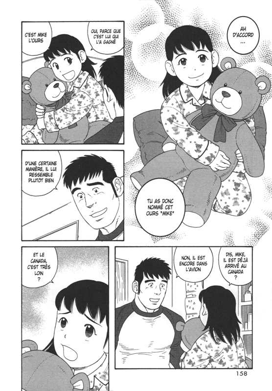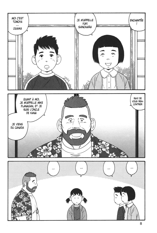 L’émotion m’a submergé page après page. Les moments ne manquent comme lorsque Mike est présenté à la famille de Yaichi devant leur tombe, les larmes de Kana qui apprend le départ de ce fameux tonton. Et surtout la discussion à l’école avec le maître et le père de la petite fille sur les remarques et les jugements des autres. « Vous êtes inquiet car j’élève ma fille seul, sans sa mère je suppose? Je vous remercie pour l’attention que vous nous portez mais vous n’avez aucun souci à vous faire. Nous comparer aux autres familles et constater qu’il n’y a qu’un seul parent au sein de notre foyer n’est une raison ni valable ni suffisante pour s’inquiéter à notre sujet. Par ailleurs, en ce qui concerne Kana, si à l’avenir elle devait montrer des aspects hors de la norme. A mes yeux lui demander de changer sous prétexte qu’elle est différente n’aurait aucun sens. Quant à l’étranger qui vit chez nous en ce moment et dont vous parlez, il est tout simplement l’époux de mon défunt frère, et, par conséquent son oncle. Aux yeux de Kana, c’est son oncle adoré. Je n’ai aucune raison de lui demander d’arrêter d’en parler. Si jamais par la suite, il advenait qu’elle soit martyrisée par d’autres élèves à cause de ça, je ne doute pas qu’en tant qu’enseignant, vous aurez la lucidité de traiter le problème non pas en vous focalisant sur l’enfant qui subit les brimades, mais sur ceux qui les infligent. » Quelle tirade incroyable et d’une puissante efficacité. On aimerait pouvoir remettre à sa place souvent les gens avec une telle intelligence.