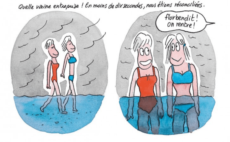 Florence Dupré la Tour revient dans un deuxième tome comme prévu. Elle continue de raconter sa vie lorsqu’elle était enfant. Son quotidien n’a rien de vraiment très ordinaire. La bédéaste est issue d’une famille nombreuse et catholique avec son lot de non-dits. Par conséquent, c’est difficile de poser des questions sans que cela soit gênant. Alors, à 11/12 ans on invente des réponses qui sont forcément biaisées. Comment comprendre aussi une relation fusionnelle avec une soeur jumelle? L’adolescence passe par là avec son lot d’hormones. Donc pour la première fois, c’est la rupture et même une séparation. Sortir l’une sans l’autre. Ce moment est illustré sur plusieurs pages et c’est assez drôle. On y voit une succession de catastrophes naturelles plus épouvantables les unes des autres. Une façon très élégante d’illustrer le raz-de-marée émotionnelle ressenti. Puis l’idée de devenir seule est quelque chose de terrible même s’il y d’autres soeurs et frère. Un récit authentique dans lequel de nombreux adultes vont se reconnaître. La transition du monde de l’enfance à la puberté ne se fait jamais avec aisance. Ici on assiste à une forme de règlement de compte qui va prendre des proportions plus importantes pour la suite. On sent que se sentir exclu a profondément marqué la narratrice, comme une force de trahison. Car elle l’a été pré-adolescente jusqu’à ses 18 ans où elle a été remplacée par une bonne copine. La colère règne, c’est palpable. Par conséquent, la famille devient juste un cadre. La mère pleure sans cesse, pourquoi? La situation professionnelle devient plus tendue pour le père, pourquoi? On n’en sait rien. Pourquoi en parler d’ailleurs? L’important est le ressentiment de Florence. Le tome est moins amusant et divertissant que le premier. La suite s’annonce encore plus virulente et sans pitié.