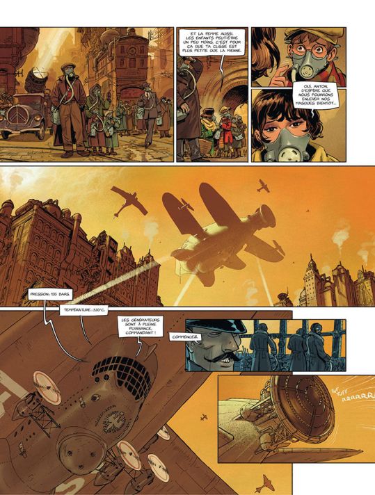 Les séries de SFFF ont abordé de nombreuses catastrophes environnementales. Pas besoin de regarder l’actualité pour en inventer. Surtout que souvent la réalité dépasse la fiction. Philippe Pelaez décide de s’attaquer à l’air. Qui maîtrise l’accès à l’air, possède un droit de vie et de mort sur tous. Une bonne base pour créer une aventure avec son lot de rebondissements Tout est posé pour que l’on découvre toute la vérité dans le tome 2, qui clôtura la série. Francis Porcel utilise un style graphique réaliste faisant référence au dieselpunk. Il intègre quelques éléments d’iconographies propagandistes comme celle d’un homme qui lève le bras avec les 3R qui ne sont pas liés à l’écologie. Mais avec un objectif sociétal : responsable, réaliste et résolu. Cela prend sa place aussi dans l’univers qui n’est pas sans évoqué Jules avec des aéronefs et des bathyscaphes. On sent l’osmose parfaite entre les deux créatifs, qui ne sont pas à leur première collaboration. L’histoire se lit facilement avec de nombreux détails de contexte. On se laisse porter sans être pour autant transporter. Cela reste assez classique ce qui pourra réjouir les adeptes du genre.