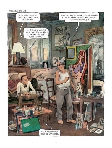 Après »Isadora » et »Pablo », c’est un vrai ravissement de retrouver la plume de Julie Birmant et le crayon virtuose de Clément Oubrerie. Le brillant et ingénieux duo continue de nous faire découvrir avec passion le monde de l’Art. Impossible de ne pas tomber sous le charme quand on a déjà gouté à cette dose de fantaisie, on en veut encore. D’autant plus que l’on voit le travail et la démarche créative aussi bien d’un artiste que de mouvements. On s’émerveille de « La révolution surréaliste » avec Aragon, Eluard, Queneau, Man Ray, Miro,Prévert… Ce qui est important est l’émergence du Dali encore un peu timide, nébuleux voyant bien des choses mystérieuse. On voit poindre doucement le début de l’histoire d’amour avec Gala, la muse. Tout est tisé avec beaucoup d’habileté, de délicatesse et d’humour. Nous sommes captivés de la première à la dernière page. A telle point qu’à la dernière case, nous avons qu’une seule et unique volonté : lire la suite.
