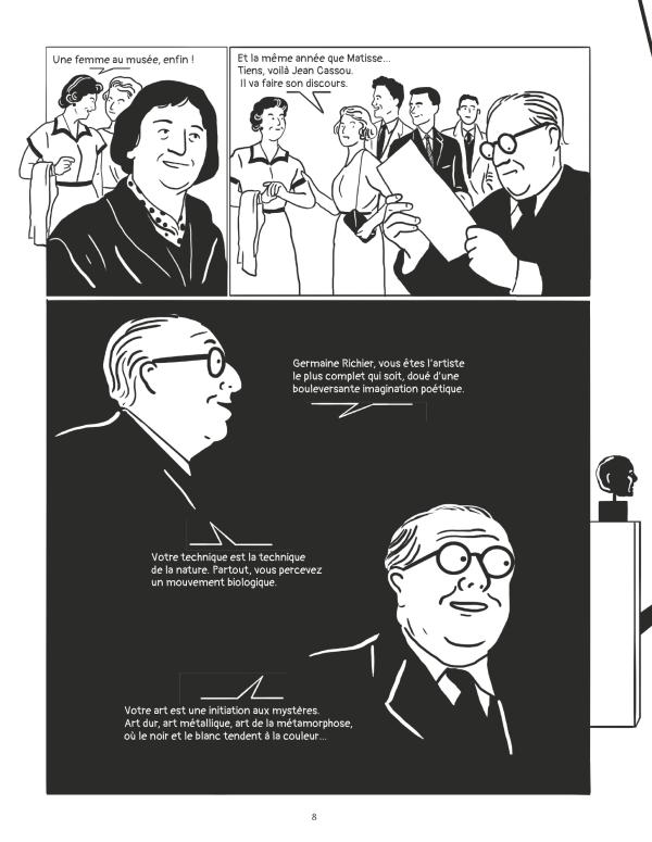 En 2022/2023, les portraits de femmes sont à l’honneur dans la bande dessinée. L’insertion des femmes dans l’Histoire commence à se faire et pas uniquement dans le 9e art. On peut le voir avec le succès de Mona Chollet par exemple. C’est plaisant à lire car on découvre l’évolution du parcours d’artiste de Germaine Richier et sa personnalité. On est plongé dans la conception, la fabrication, l’inspiration, sa technique, ses essais/erreurs, son lien avec des journalistes, des créatifs… Sans omettre l’importance pour elle de transmettre son art avec des élèves aussi bien homme que femme. On y voit une femme libre, autonome et passionnée. En son temps, elle a été perçue comme une femme malgré son sexe. Le seul soucis rencontré a été des opposants à la commande dans une église. Des intégristes religieux s’oppose à l’exposition de l’oeuvre. C’est impudique qu’une femme réalise JC sur une croix. Pourtant les professionnels et des croyants trouvent la réalisation fabuleuse. Qu’importe la qualité du travail, être une femme reste un outil de discrimination. Cela prouve la persévérance d’une créatrice prête à tout pour créer même ces humains insectes.