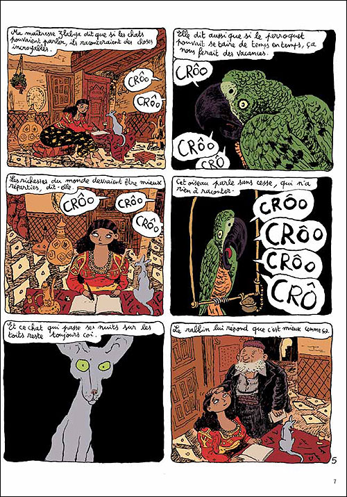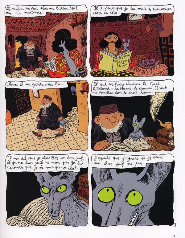 Le Chat du Rabbin, c’est Alger et le quartier juif au début du siècle. Celui qui regarde ce monde et qui raconte, c’est « Le Chat du Rabbin. » Tout de suite, il explique pourquoi le Rabbin n’a pas plutôt un chien : « ça fait tellement longtemps que les juifs se font mordre, courir après ou aboyer dessus que, finalement, ils préfèrent les chats. » Le chat mange le perroquet de Zlabya, la fille du Rabbin, et du coup, le voilà doté de la parole et exigeant de faire sa bar-mitzva. Les discussions vont être longues tant avec le Rabbin lui-même qu’avec le Rabbin du Rabbin. Ce chat, qui a une allure graphique à pleurer de rire, tantôt matou tendre amoureux de sa maîtresse, tantôt sournois filou, tient tête à tout le monde et ergote à n’en plus finir. Il ne se calme que dans la douceur des bras de sa maîtresse. Mais il lui est interdit de lui parler, alors il nous confie: « c’est la condition, si je veux rester avec elle. Ça vaut le coup de fermer sa gueule pour être heureux ». Ceci ne l’empêchera pas de se mettre sur la piste des étudiants qui fréquentent l’école du Rabbin, car l’un d’entre eux a le désir d’épouser la jolie Zlabya.
