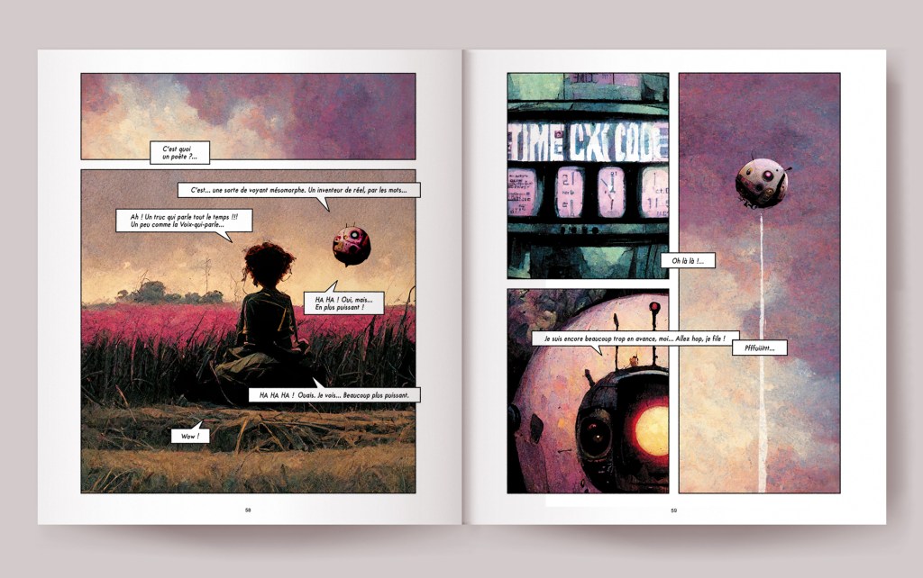 Thierry Murat n’est pas à sa première bande dessinée. Il a fait sa place aussi bien du côté du scénario que du dessin. En 2020, il écrit un scénario qu’il met de côté. Suite à la motivation de sa progéniture, il décide de faire son art autrement. Il se lance dans la conception du dessin par le biais d’une IA, Midjourney 3. Cinq mois de travail a été nécessaire pour aboutir à 150 pages. Son éditeur refuse de la publier à cause de son choix d’outil. Qu’importe. Il lance une campagne sur Ulule pour récolter 23 354€ sur les 19 400€ demandé. L’album est tiré à 2.000 exemplaires, sous le label Log Out qu’il a créé. Et comme l’IA et BD restent peu fréquent, les médias ont décidé de parler de l’ouvrage. Principalement de son choix d’édition et non sur le récit en lui-même. Mais de la com, c’est toujours bon à prendre.