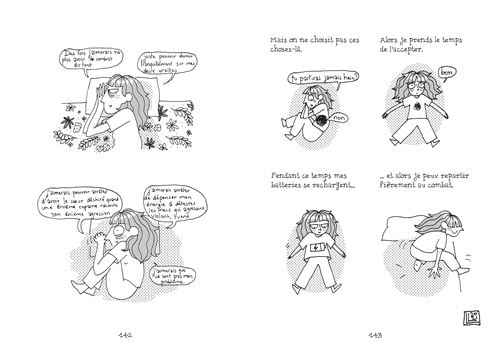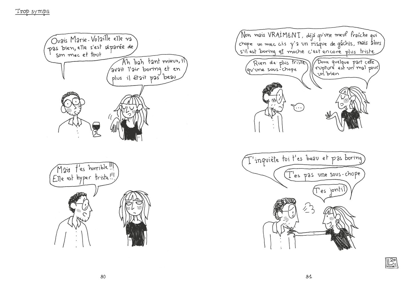 Lucie Lgt présente son livre dans son avant-propos. Elle propose un recueil de ces dessins réalisés entre 2018 et 2022. Et « ça parle d’amour, de féminisme, de tracas du quotidien, de découverte de soi et du monde, de blessures et de guérison, bref de plein de choses, parfois rigolotes et parfois moins. » Elle en profite aussi pour prévenir le lecteur : « Je préfère donc t’avertir ici que par endroits, j’aborde des thèmes qui te remueront peut-être : préserve-toi, n’hésite pas à sauter des pages ou à refermer le livre pour un temps ou pour toute la vie. » (p. 10). Par la suite, comme elle possède un langage bien à elle et propre à certains milieu, elle nous met un lexique. C’est assez pratique car en effet tout n’est pas compréhensible comme askip, fancy, go, oklm, track ou undercut. Quand on n’est pas jeune et en dehors d’une communauté, une forme de langage nous échappe. Donc c’est assez bien de nous faciliter la lecture pour la suite.