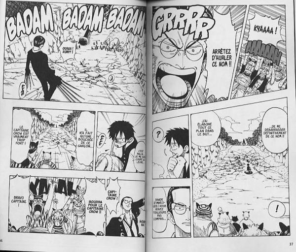 Ce qui détonne dans One piece c’est le graphisme assez disproportionné. Souvent les femmes ont des grosses têtes sur des petits corps. Les expressions des visages sont très marquées. On comprend rapidement les émotions. Pour mieux se faire une idée, il suffit de regarder la couverture. Les bouches sont gigantesques. Cela change radicalement de « Naruto » ou « Dragon Ball ». On sait que cela n’ira pas en s’améliorant, c’est juste la pate esthétique de la série.