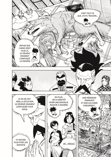 Les monstres rôdent et ils sont sans pitié. Les conditions climatiques restent difficiles. La nourriture se raréfie progressivement. Si on ne trouve pas de solution, tout le monde va mourir. Par chance, les chasseurs cueilleurs rencontrent une femme errante et seule. Elle très forte ce qui lui permet de terrasser un monstre. Elle partage son secret pour que l’expérimentation se fasse à plus grande échelle. Par contre, elle ne cache pas les risques mortels. Tuer les créatures étranges pour s’approprier leur force. Un prix sera à payer. Nous le devinerons à l’avenir. Toute la communauté hésite à partir car trop d’incertitude. Au final, tout le monde doit partir vers ce lieu inconnu. Pourquoi des gens vivraient en toute quiétude en laissant les autres dans la misère? Qu’est-ce que cela cache? Une fois sur place, le lecteur en saura plus.